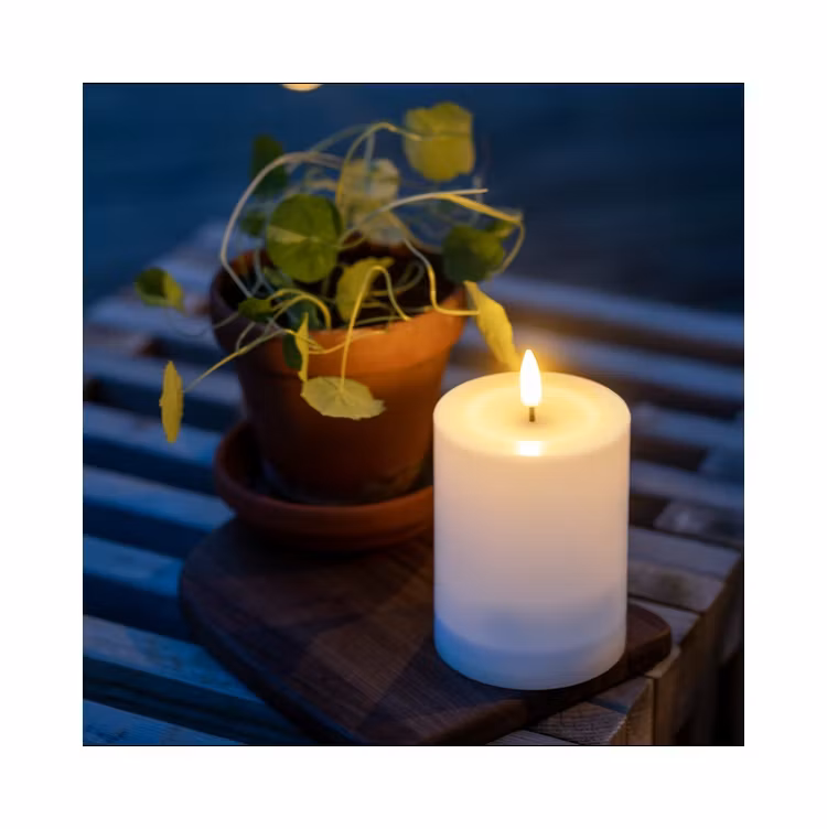 Solcellsljuset Flamme Saul är ett vitt plastljus som passar bra att lysa upp i en lykta eller som dekoration på till exempel en uteplats eller en balkong, den går också utmärkt att placera på en minnesplats där den lyser upp när mörkret faller. Med sin realistiska flamma lyser den upp med ett varmvitt sken. Detta ljus har en dold panel inuti plasthöljet och ska placeras så solen når ljuset under dagen för att uppnå den bästa laddningen till det medföljande batteriet.